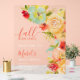 Este símbolo de bienvenida de la ducha nupcial de otoño, inspirado en el boho, combina maravillosamente las flores de acuarela pintadas a mano con tonos cálidos y otoñales. El diseño es vibrante y cuenta con un ramo de rosas, dahlias y peonías con tonos naranjas, rojos y verde suave, que evocan la esencia de la temporada. El audaz guión de "Caer en el amor" presenta elegantemente la celebración, mientras que el diseño proporciona un mensaje de bienvenida a los invitados. Este letrero no sólo marca la pauta para un evento rústico y acogedor, sino que también añade un toque personal y artístico a la entrada de la ducha de novia.