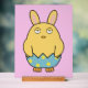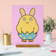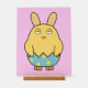 Una chica gordita, sin impresionar, vestida como conejito, mitad dentro de un huevo decorado—La Pascua nunca se ha visto tan aburrida!
