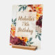 Celebre con un estilo atemporal con este signo de 11"x14" de cumpleaños acrílico claro con elegantes flores acuáticas en cálidos tonos de naranja, burdeos y oro. El traslúcido fondo le da un sofisticado toque moderno, mientras que el texto del personalizable —mostrado aquí con "Cumpleaños 75 de Michelle"— lo hace perfecto para cualquier celebración histórica. Ideal para ver en una mesa o caballete, este cartel de acrílico floral le da un acento impresionante a las entradas, mesas de postre y telones de fondo fotográfico.
