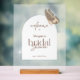 The sign itself is crafted from beautiful frosted acrylic, offering a contemporary, semi-transparent finish that diffuses light beautifully for a soft, ethereal glow. A crisp white arch is prominently placed in the center, providing a clean and refined backdrop for your personalized details, while the remaining portion gracefully showcases the frosted acrylic texture. A delicate butterfly subtly adorns the design, adding a whimsical touch that perfectly complements the minimalist aesthetic.