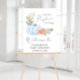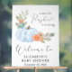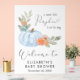 Un lindo cartel blanco acrílico de ducha de bienvenida con "A Sweet Little Pumpkin Is On Your Way" en una tipografía gris moderna y un guión de moda con un toque cardíaco, y una acuarela de calabaza azul pastel, flores y vegetación. Personalice el nombre de la madre y la fecha de la ducha en una simple tipografía gris.