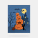 Un gato negro y una escoba de brujas cerca de una pila de calabazas que se están cayendo. Un árbol muerto, una mansión espeluznante, algunos murciélagos y la luna son vistos en el fondo.