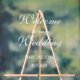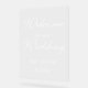 Cartel de bienvenida minimalista de boda blanco con un elegante guión de caligrafía, impreso en acrílico transparente. Personalizar los colores para que coincidan con el tema.