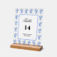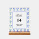 Un letrero de acrílico para números de mesa con hermosas flores de campanilla azul. El fondo y la imagen se pueden personalizar. Obra de arte original de W.B.