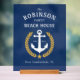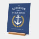 Personalice su casa de vacaciones con un elegante cartel de acrílico con temática náutica. Simplemente introduzca su nombre familiar, casa de playa (o cabaña de la casa del lago, etc), fecha establecida y ubicación u otro texto deseado según sea necesario. Personalizable fácil. Entre las características de diseño se incluye un ancla de barco hecho en personalizado, de color blanco, con hojas de laurel de color oro y una estrella sobre un acrílico azul marino impresionante.