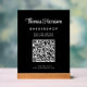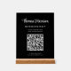 Signo de tabletas de acrílico negro moderno con tu nombre en un guión elegante de firma blanca y tipo de negocio con letras blancas simples. Ingresa tu dirección de sitio web para crear un código QR escaneado para que clientes y clientes vean tus productos, servicios, horas, etc.