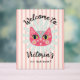 Cartel de bienvenida del gato de Cute Daisy. Presenta un arte folclórico hippy inspirado en el gato rosa la margarita azul pálido con fondo rayado. ¡Se puede cambiar toda la redacción! Para realizar más cambios, vaya a Personalizar esta plantilla. En la parte inferior verás "¿Quieres personalizar este diseño aún más? Haga clic en la herramienta EDIT using Design. A partir de ahí puede cambiar algunas fuentes y algunos colores, mover cosas o borrar lo que necesita.