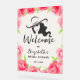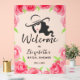 Un cartel de bienvenida acrílico con una ducha de novia incluye una silueta de mujer bordeada de rosas de color rosa. COINCIDIENDO elementos de nuestra colección.