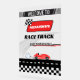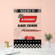 Cartel de bienvenida de la fiesta de cumpleaños de un niño con tema de carrera divertida con ilustracion de un auto de carrera retro rojo. El texto dice "bienvenido a xx track".