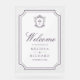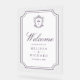 Elegant catholic wedding welcome sign featuring beautiful victorian crest with intricate details.