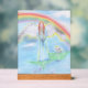 Dibujo de un ángel que guía a un perro peludo sobre el puente arco iris