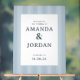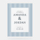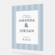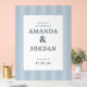 This elegant wedding sign features a clean, centered layout with vertical light blue stripes creating a subtle gradient effect. The design uses a soft sky blue and slightly darker blue palette, complemented by classic serif typography that adds a formal touch. Customizable text fields allow for personalization of names, location, and date, making it perfect for celebrating your special day in style. The overall mood is sophisticated and inviting, ideal for setting the tone at any wedding event.
