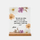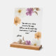 A stunning transparent acrylic sign featuring a delicate arrangement of soft white, peach, and purple wildflowers with elegant greenery. The design beautifully frames a heartfelt romantic quote