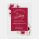 Welcome your wedding guests with this beautiful acrylic sign. The rustic boho chic floral design features elegant script calligraphy with delicate swashes or flourishes on the ends of the letters along with your names in white print on a deep magenta colored background. The center text area is surrounded by a transparent border with hand painted watercolor roses and garden greenery in shades of hot pink, magenta, and blush. Beautiful way to welcome your guests while adding beauty and style to your event.
