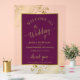 Welcome your wedding guests with this beautiful acrylic sign. The stylish design features elegant script calligraphy with delicate swashes or flourishes on the ends of the letters along with your names in gold print on a magenta plum or berry purple colored background. The center text area is surrounded by a transparent border with a golden faux foil frame and delicate floral curls and swirls in the corners. Lovely way to welcome your guests while adding beauty and style to your event.