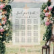 Elegante gráfico de asientos boda con acrílico congelado para hasta 16 mesas con "encontrar tu asiento" en un guión de moda y tus nombres y fecha boda unidos por un corazón en una simple tipografía moderna.