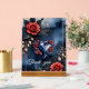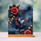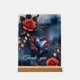 Elegante arreglo rosa con follaje dorado sobre un fondo de color azul oscuro. Un diseño elegante y decorativo con rosas rojas, hojas oscuras y acentos dorados sobre un fondo de color azul profundo y acuarela. El delicado marco dorado y la distribución equilibrada de las flores le confieren un encanto refinado y sofisticado. Perfecto para todo aquel que ame el elegante arte floral, los rosas románticos y los lujosos contrastes de color. Ideal para el arte en la pared, decoración en casa, accesorios de moda y regalos con un toque de sofisticación.