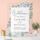 Elegante cartel de bienvenida de boda floral con nombres, fecha boda y ubicación boda enmarcada por polvorientas rosas azules y blancas e hortensias con exuberantes hojas de eucalipto y vegetación. Esta polvorienta señal acrílica de bienvenida boda floral azul es perfecta para su primavera o boda de verano! Diseñado para coordinar con nuestra colección de bodas Elegante Dusty Blue Floral.