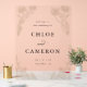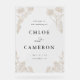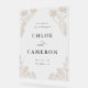 El diseño presenta una caligrafía vintage elegante inspirada en fuentes de escritura tradicionales. El diseño incluye delicado arco floral de mano inspirado en el enrejado del jardín con rosas entrelazados, flores y hojas. Minimalista y elegante perfecto para bodas tradicionales y de jardín.