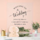 Bienvenido a sus bodas invitados con esta hermosa señal acrílica. El diseño romántico se compone de un único rosa de color melocotón pálido y largo, que se encuentra en un lado con un espejo y una piscina de agua. El elegante título de caligrafía del guión incluye los intercambios de encajes o florecimientos en los extremos de las letras, y a continuación aparecen los nombres de la pareja y la fecha del boda.
