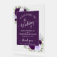 Bienvenidos a sus invitados de boda con esta hermosa señal de acrílico. El diseño floral rústico boho chic presenta caligrafía elegante con florituras delicadas o florituras en los extremos de las letras junto con sus nombres en impresión blanca sobre un fondo de color ciruela profundo. El área de texto central está rodeada por un borde transparente con rosas pintadas a mano con acuarela y follaje de jardín en tonos de púrpura, lavanda y ciruela. Hermosa manera de dar la bienvenida a sus invitados mientras agrega belleza y estilo a su evento.