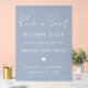 boda de moda sin asignación de asientos semitransparentes y polvoriento cartel acrílico azul con "Escoja un asiento, a cada lado, te encantan tanto el novio como la novia" en una mezcla de simple y moderna tipografía blanca y un elegante guión blanco, un corazón y tus nombres y fecha boda.