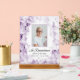 Recuerde la vida de su ser querido después de su muerte con la elegante celebración de color de agua morado de hidrangea de flores de la vida Funeral de Rótulo acrílico. Esta señalización conmemorativa de flores de bonito presenta una fotografía floral de acuarela digital pintada de pétalos de flores de hidrato púrpura con fondo blanco y las palabras En recuerdo. Siéntase libre de cambiar el texto y personalizarlo con una fotografía, nombre y fechas.