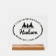 Este diseño de señas acrílicas simple pero eficaz, presenta una línea de abetos gráficos sobre su nombre en texto de guión y su dirección u otro texto en un entorno ovalado. Perfecto para publicidad promocional de empresa en una tienda, o en una casa rural. Busque ID304 para ver productos adicionales con este diseño.