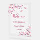 This elegant wedding welcome sign features beautiful pink cherry blossoms and two cute butterflies on a transparent white background.