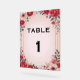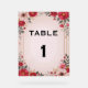 Flores rojas, rosas y blancas rodean un marco doble dorado, sobre un fondo rosado concha para crear un hermoso cartel de mesa boda. Muy elegante y perfecto para un boda formal.