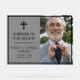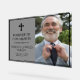 Cartel acrílico del servicio funerario cristiano con una cruz negra, para siempre en nuestros corazones y los nombres de sus seres queridos y años de vida impresos con fuentes negras contra un transparente fondo acrílico negro al lado de una foto de su ser querido. Negro transparente para siempre en nuestros corazones símbolo acrílico para un servicio conmemorativo personalizado con una foto de su ser querido.