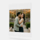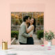 Esta señal de boda presenta un diseño romántico e íntimo con una fotografía central de dos personas abrazándose frente a un invernadero bellamente iluminado. Las cálidas luces ámbar y amarillas contrastan con los suaves verdes y blancos de su vestimenta, creando una atmósfera acogedora e invitadora. La elegante tipografía cursiva en la parte superior dice "bienvenidos", mientras que los espacios personalizables para nombres y fechas se presentan en letras mayúsculas serif y fuentes sans-serif simples debajo de la imagen. La disposición general es equilibrada y centrada, enfatizando la alegría y la celebración, lo que la hace perfecta para mejorar la ambientación de su día especial.