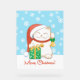 Un gato blanco sonriente en un gorra tradicional de Navidades rojos con un gran regalo envuelto le desea a todos una Feliz Navidad! En su pata izquierda, el gato está sosteniendo una campana dorada con una proa verde.