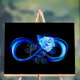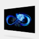 Luminous infinity symbol with glowing, beautiful, lushly blooming rose made of blue flames on black background.