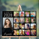 Cartel de bienvenida y keepsake de la fiesta de graduación acrílica negra con un collage de 17 fotos del graduado a lo largo de sus años escolares y su nombre en un elegante guión blanco. Añade tus subtítulos personalizados bajo cada foto.
