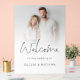 Moderno programa de fotografía de escritura moderna Bienvenido al Boda. estilo minimalista para saludar a sus huéspedes en un acrílico elegante. Simplemente reemplace la foto de muestra por la suya propia, que está detrás de una capa tintada graduada donde el texto está parcialmente colocado sobre ella. La bienvenida está en un guión elegante y el resto del texto que puede personalizar fácilmente.