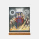 Hekate is a triple Goddess featuring the Maiden, Mother and Crone. Their braids are woven together showing that all three aspects are the same being. Each aspect holds a distinct item; key, torch, and dagger. They are surrounded by swirling flames and the dark moon, and mystical Hekate's Wheel. Two black dogs stand beside them, adding to the mysterious atmosphere, while the triple moon phase crown adorns the background.