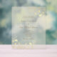 Esta invitación de acrílico de 8x10 pulgadas de estilo vintage presenta flores doradas y caligrafía moderna elegante, perfecta para una boda chic e íntima o invitados especiales. Su tamaño único requiere sobres personalizados, que deben ser adquiridos fuera del mercado de Zazzle. Ideal para parejas que buscan un anuncio de boda sofisticado y memorable.