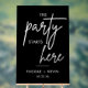 El Fiesta comienza aquí el moderno cartel de bienvenida boda con tipografía de caligrafía y el nombre de la novia y Groom junto con la fecha boda. Haga clic en el botón "herramienta de diseño" para personalizar más adelante.