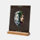 León blanco y mujer - Retrato místico de fuerza y belleza. Un retrato cautivador que combina el poder majestuoso de un león blanco con la delicada belleza de una mujer. El lado izquierdo revela la orgullosa cabeza del león con su mané flotante, mientras que el lado derecho muestra a una mujer con piel suave, pelo castaño y labios rojos audaces. Las hojas verdes y las pequeñas flores conectan las dos mitades, simbolizando la armonía entre la naturaleza, la fuerza y la feminidad.