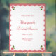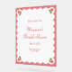Bienvenidos a sus invitados con este letrero de bienvenida para baby shower nupcial de rosa rosa dulce y sofisticado. Con encantadoras ilustraciones de capullos de rosa en cada esquina, un borde blanco festoneado y un fondo rosa rosado, este diseño agrega un toque romántico a su celebración. Las fuentes serif y script elegantes dan un toque clásico, lo que lo hace perfecto para fiestas de jardín, duchas con tema de té o cualquier evento que celebre el amor y la belleza. Personalice con el nombre de la novia, la fecha y la ubicación para un detalle encantador y personalizado.