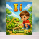 The scene shows a gentle, playful interaction where the child is observing or calmly interacting with the iguana, adding light movement and storytelling to the design without overpowering the letter.