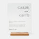 Estilo su mesa de regalo con este elegante cartel acrílico de "Tarjetas y Regalos". Con un diseño minimalista moderno con una mezcla de fuentes serif y script, este signo claro es un elegante añadido a cualquier decoración boda. Mostrado sobre una base de madera, expresa gratitud a los huéspedes por sus atentos regalos y buenos deseos. Un toque perfecto para las mesas de recepción y las señales bodas.