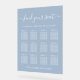 Moda polvorienta tabla de asientos de boda acrílico escarchado azul para hasta 12 mesas con "find your sit" en un elegante guión blanco con chispas, "We are happy you are here" en moderna tipografía blanca y tus nombres y fecha boda unidos por un corazón.
