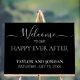 The design features a striking white-on-black aesthetic that stands out in urban lofts, gallery spaces, or chic rooftop venues. The layout showcases a romantic, oversized "Welcome" in an elegant flowing script, followed by the heartfelt phrase "TO OUR HAPPY EVER AFTER." The couple's names, "TAYLOR AND JORDAN," are displayed in a bold serif font, accompanied by the wedding date for a professional, branded feel. Designed to look stunning on black or frosted acrylic, this sign offers a polished, luxurious finish that complements a modern wedding theme.