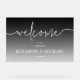 Un signo de bienvenida ACRYLIC presenta un degradado negro transparente y los detalles de su boda en letras de moda. Cambiar a cualquier tamaño.
