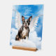 Un magnífico mascota conmemorativo con el nombre y la raza de su perro. Este perro ángel flotando sobre las nubes en el cielo es un perro del Boston Terrier con alas y un halo.