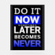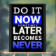 A bold motivational poster with Do It Now in white on black, highlighted NOW in blue, and the words Later and Never below. Encourages action, focus, and productivity in work or study spaces.