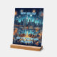 In the foreground, a group of people gather around a cozy fire pit, enjoying each other's company and the festive spirit. The scene is filled with warmth, laughter, and the anticipation of the new year. The artwork's intricate details, including the twinkling lights, the bustling city streets, and the festive decorations, create a sense of wonder and excitement.
