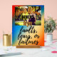 Una señal acrílica con un soporte de madera, compartiendo un mensaje oportuno y sabio. No culpes a otros por tus defectos, miedos o fracasos. Mostrando un chica en el fondo levantando la cabeza y rezando. Los colores son azul, rojo, amarillo, negro y naranja.